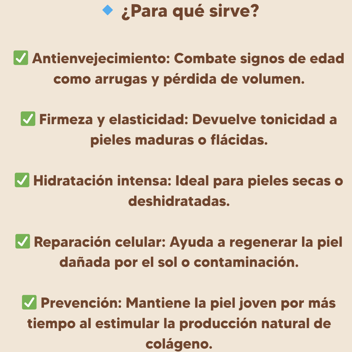- 🔥 EFECTO ANTI-EDAD INTENSO – El colágeno y la elastina regeneran las fibras de la piel, reduciendo arrugas y líneas de expresión hasta en un 40% en 4 semanas.